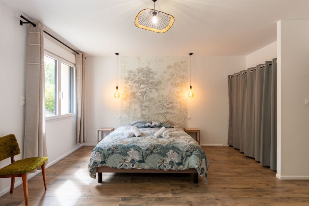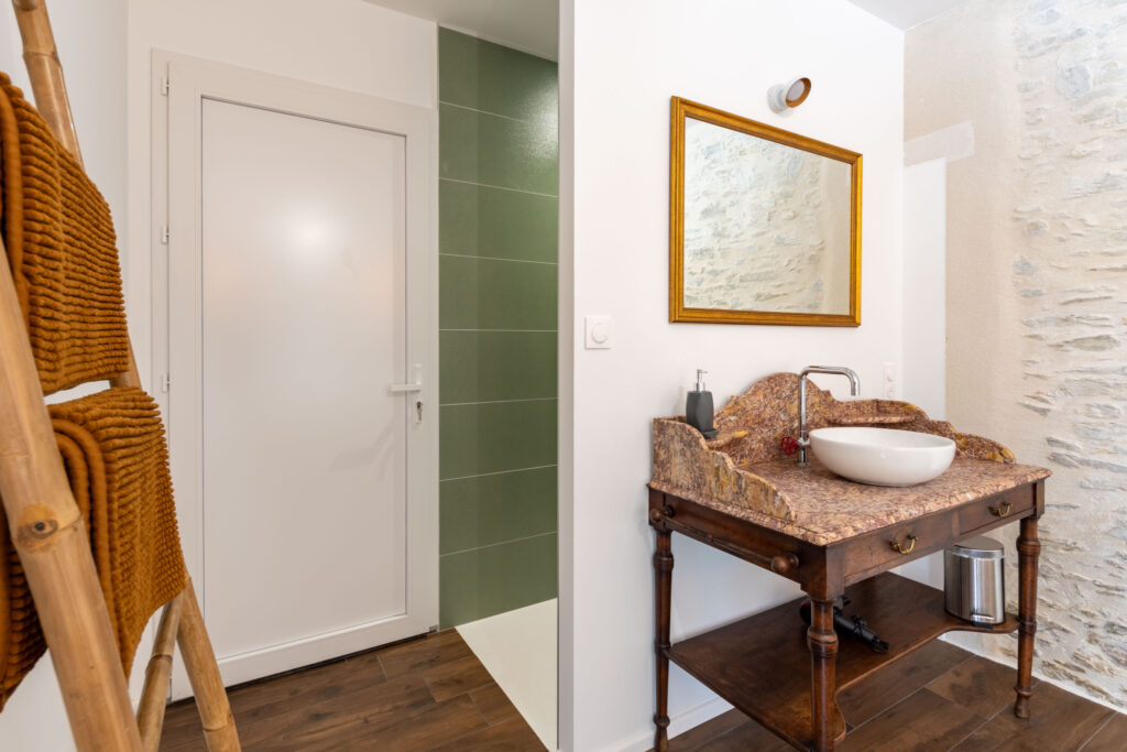 Dès l’entrée, le rez-de-chaussée dévoile une chaleureuse pièce de vie où la pierre et le bois composent une véritable symphonie d’élégance et de convivialité. La cuisine, entièrement équipée et ouverte sur le salon, devient un lieu de partage idéal pour se retrouver en famille ou entre amis. Ce niveau accueille également deux superbes suites parentales, ainsi qu’un WC indépendant. Entièrement accessible aux personnes à mobilité réduite, le rez-de-chaussée a été pensé pour garantir confort et sérénité à tous.