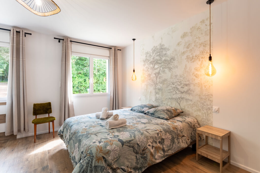 Depuis la cuisine, un escalier vous mène à l’étage, où vous découvrirez trois grandes chambres lumineuses, une salle de bain avec douche ainsi qu’un WC indépendant. Un espace nuit parfaitement adapté pour accueillir petits et grands dans une ambiance douce et reposante.