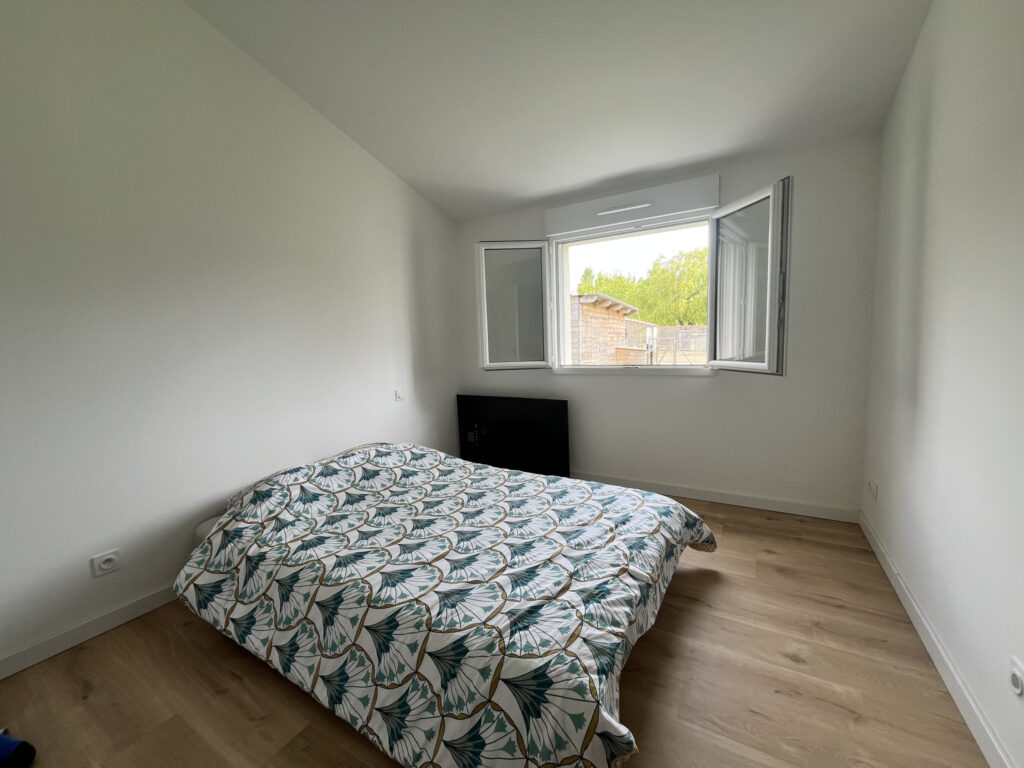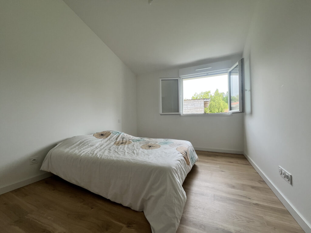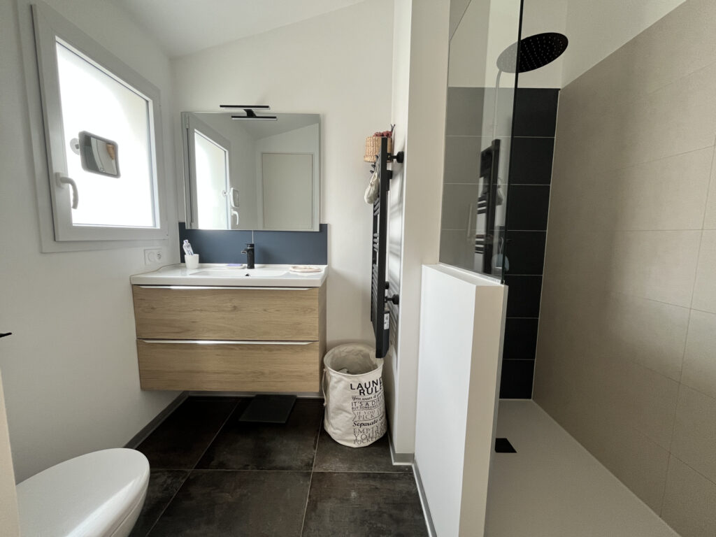 Plus loin, un couloir distribue trois chambres supplémentaires, autant de possibilités d’accueillir famille, amis ou projets de vie. Une seconde salle de bains avec douche et WC complète l’ensemble avec cohérence et praticité.