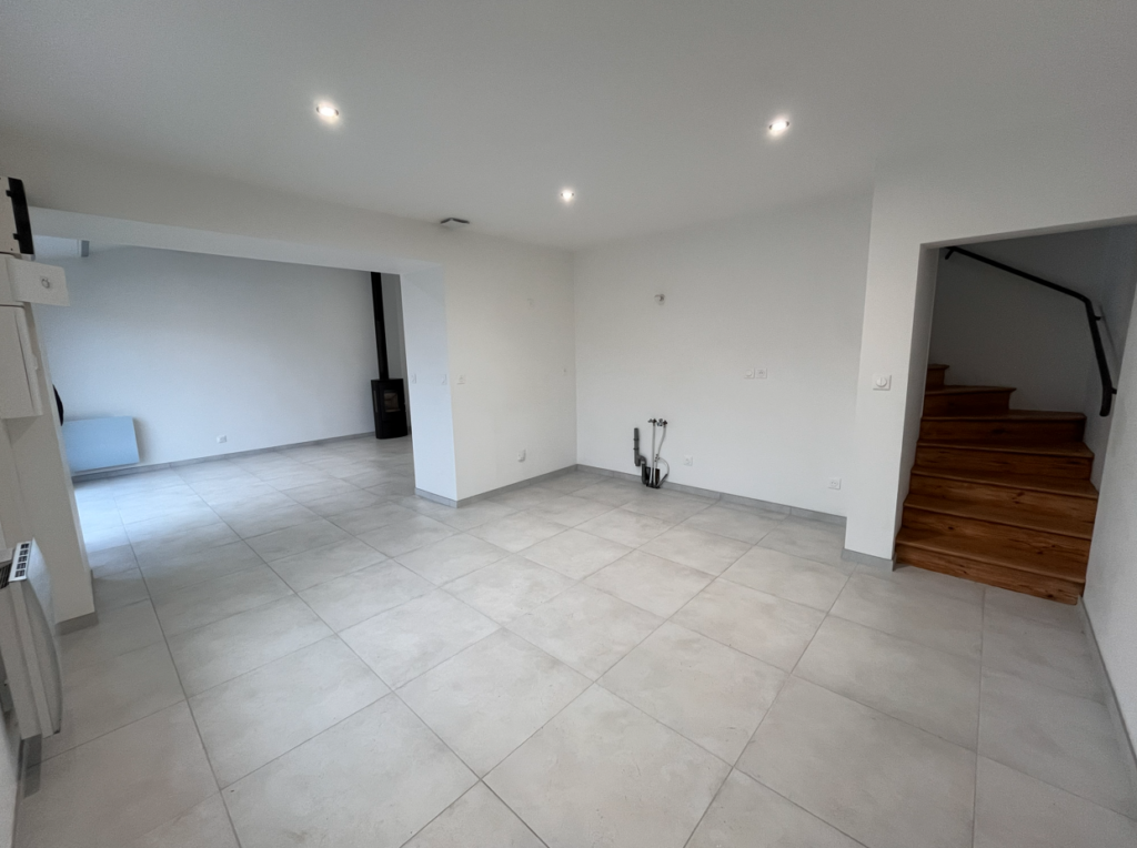 Elle s’ouvre sur une vaste pièce de vie avec cuisine ouverte, chaleureusement agrémentée d’un poêle à bois, idéale pour les moments de convivialité.