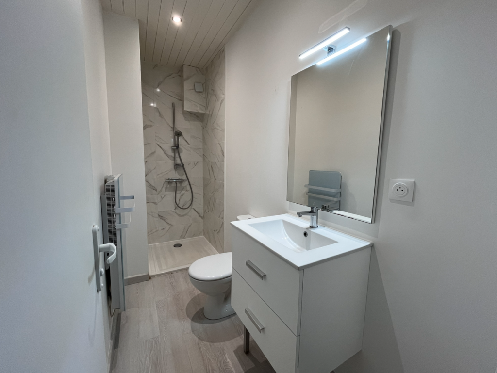 À l’étage, accessible par un superbe escalier en bois plein de caractère, vous découvrirez deux grandes chambres avec parquet bois, ainsi qu’une salle d’eau élégante et fonctionnelle.